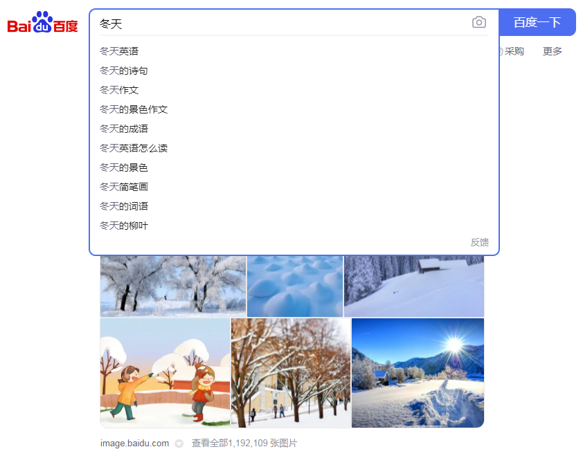 我们以搜索“冬天” 为例 出现以下下拉框: