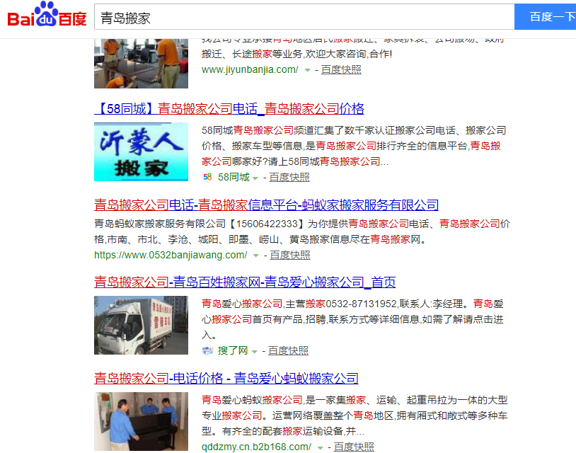 关键词‘青岛搬家’网站优化到百度首页案例如下: