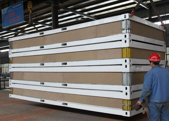 1).标准化生产、配件打包运输。拼装式集装箱房,用标准模块配件的空间拼装组合,整体结构均采用轻钢结构为骨架,安全性能极高。主要模块配件有顶板及顶框、底板及底框、墙板、角柱等,所有产品构件均由工厂预制,标准化生产。其突出特点在于构件生产完成后打包运输至现场组装,单个集装箱构配件打包后所占体积为6000mmx3000mmx50mm,普通平板货车单次运输数量可达到8个,与传统固定式集装箱单次运输1-2个相比较,运输效率提高4~8倍,见图1和图2。