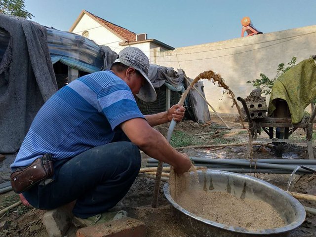 人工打井最不可少的就是沙子,而且必须是细沙,井里放沙子出的水格外的清,被成为洗井。“沙子有两个作用,一个填充孔洞(否则有报废得可能,井瓮歪斜),一个是过滤泥土,水变清澈。”