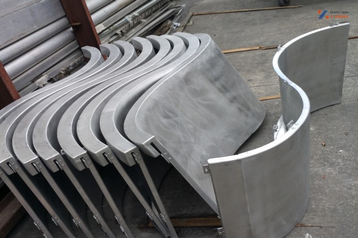 6、安装施工方便快捷。铝板在工厂成型,施工现场不需裁切,固定在骨架上即可。