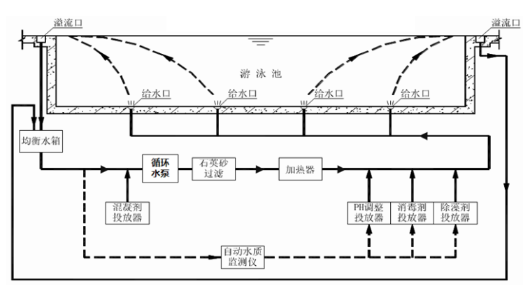 游泳池的全部循环水量,经设在池底的给水口或给水槽送入游泳池内,池水回水经池壁溢流堰溢流进入设在紧邻池壁外侧的溢流回水槽,溢流回水通过设在槽底的溢流回水口,汇入回水管,重力流入均衡水池,循环水泵从均衡池吸水送入过滤器去除回水中的杂质,降低回水的浑浊度,并对虑后循环水进行加热,水质平衡和消毒等处理后,再由池底给水口或给水槽送回游泳池继续使用的一种水流组织方式。